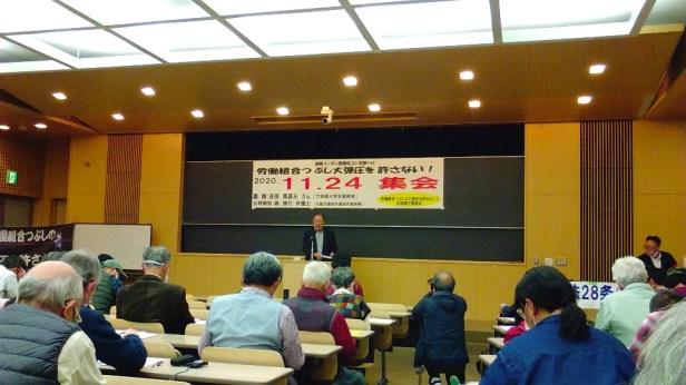 11月24日、「労働組合つぶし大弾圧を許さない!11・24集会」が、「労働組合つぶしの大弾圧を許さない!京滋実行委員会」の主催でキャンパスプラザ京都においておこなわれ、約100人が参加した。この集会は、京都地裁でおこなわれている「加茂生コン強要未遂事件」裁判の判決(12月17日)に向けて、無罪判決をかちとるために開催された。立命館大学名誉教授の吉田美喜夫さんの講演と森博行弁護士による公判報告があった。 森弁護士は、事件では「脅迫」はなく、就労証明書の発行は会社の義務。法的には無罪判決以外にありえないと説明した。