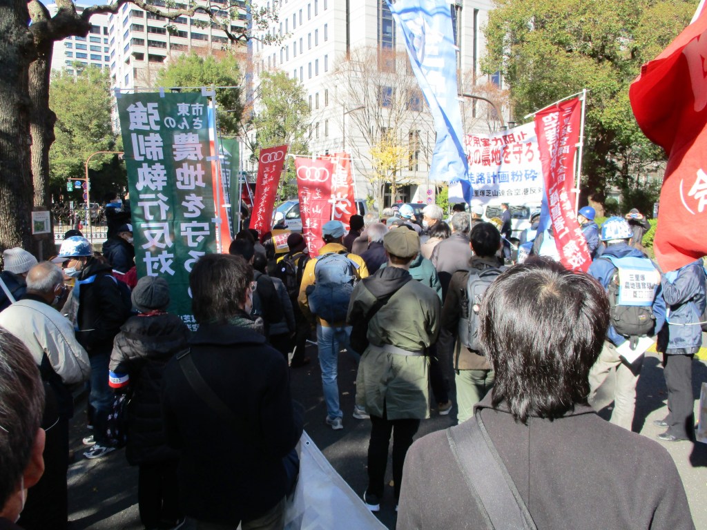 判決に先立って、日比谷公園霞門前で打ち合わせ集会がおこなわれた。あいさつに立った反対同盟の萩原富夫さんは、「どのような判決が出ようと私たちは市東さんの農地を守り抜く」と決意を語り、動労千葉、関西実行委員会、市東さんの農地を守る沖縄の会、市東さんの農地取り上げに反対する会から連帯のあいさつ。東京高裁に向かって「市東さんの農地取り上げを許すな!」「強制執行の停止決定を行え!」のシュプレヒコールとデモをおこなった。
