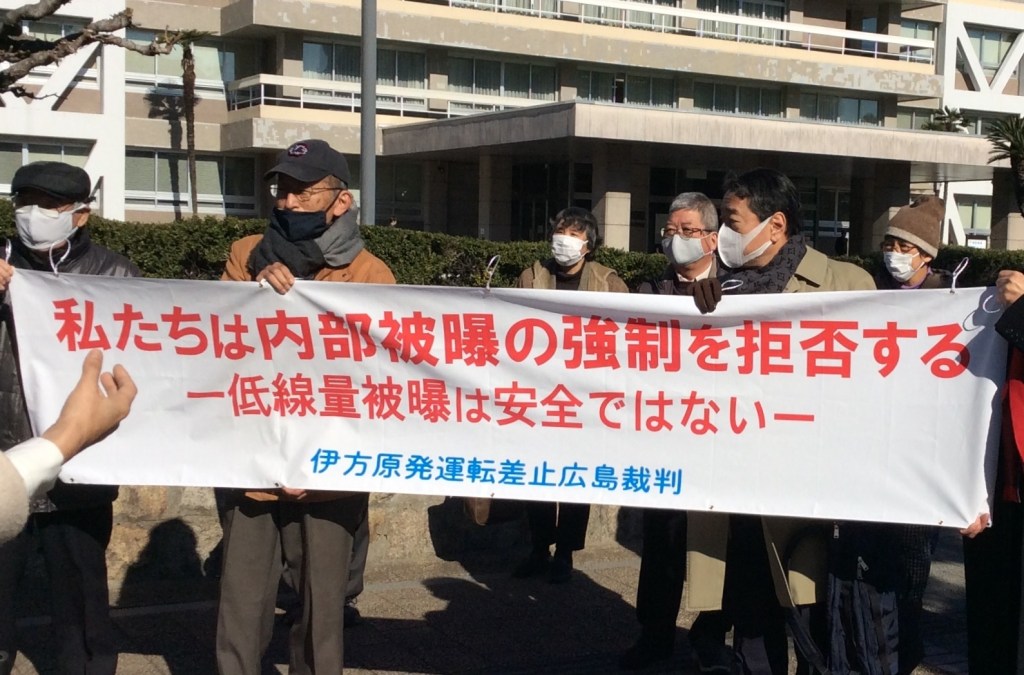 広島地裁(大森直哉裁判長)において伊方原発運転差止広島本訴、第21回口頭弁論の取り組みが行なわれた(1月20日)。新型コロナへの感染対策のため、乗り込み行進、記者会見・報告会は中止し、フィジカルディスタンスをとりながらだった。午後、広島地裁前に集まった弁護団、原告団、応援団の代表らは、「私たちは内部被曝の強制を拒否する—低線量被曝は安全ではない—」と書かれた横断幕を掲げて記録撮影を行なった。