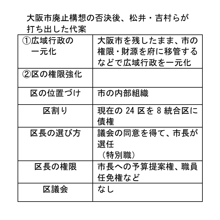 広域一元化条例は、住民投票で否決された「都構想」の簡易版です。「都構想」は住民投票で否決できましたが、広域一元化条例は議会内の多数決で決められます。