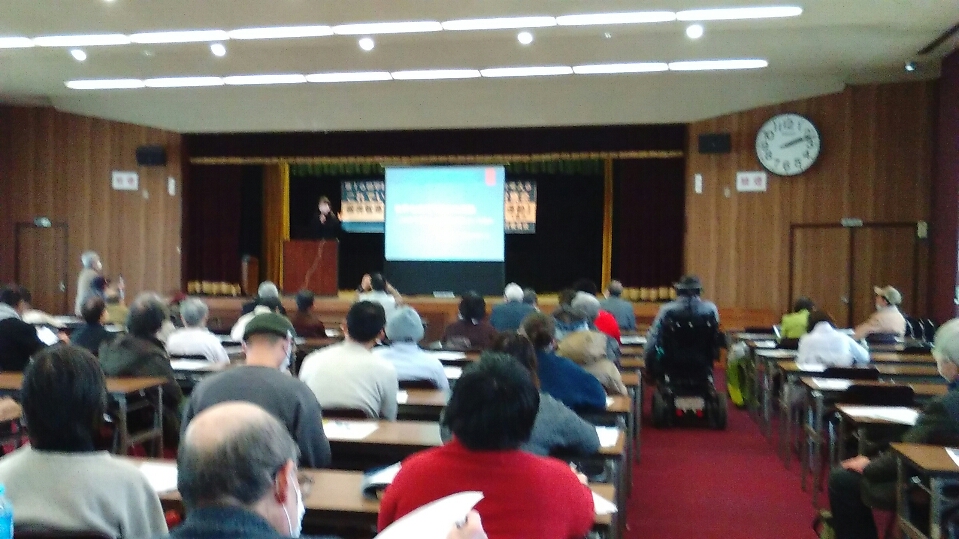 2月11日、「これでいいのか日本!2021滋賀集会」が大津市の解放県民センターでおこなわれ、参加予約制で75人が参加した(写真下)。講演は、関西学院大学の桜井智恵子さん。教育学者で、この集会の講演は2回目。演題は、「世界を滅ぼす資本の運動—コロナで露呈した近代公教育という暴力—」で、90分間たっぷり話した。