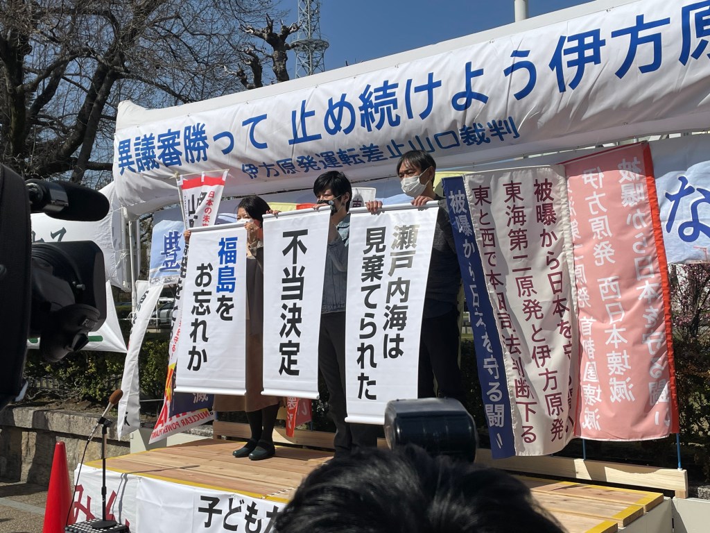 正門前に「瀬戸内海は見棄てられた」「不当決定」「福島をお忘れか」と書かれた3本の旗。弁護団共同代表の中村覚(さとる)弁護士は、「四電の主張をうのみに、危険性の立証責任は住民側が負うとした前代未聞の不当な決定。裁判所の職務放棄だ」と怒りを表わした。