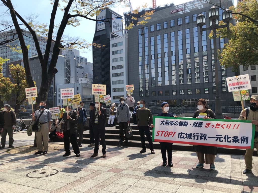 市会採決の日、市役所前で、昼休みの時間帯に反対行動が取り組まれ、午後の本会議に向けて「採決反対」「大阪市乗っ取り反対」をアピールした。条例は可決されたが、個別の事務委託規約の策定作業はこれから。立ち上がった市民らは大阪万博やカジノのための大型開発で、市の権限と財源を大阪府に奪われないよう、議会の監視を強化し、市民に情報を公開する活動を続ける。