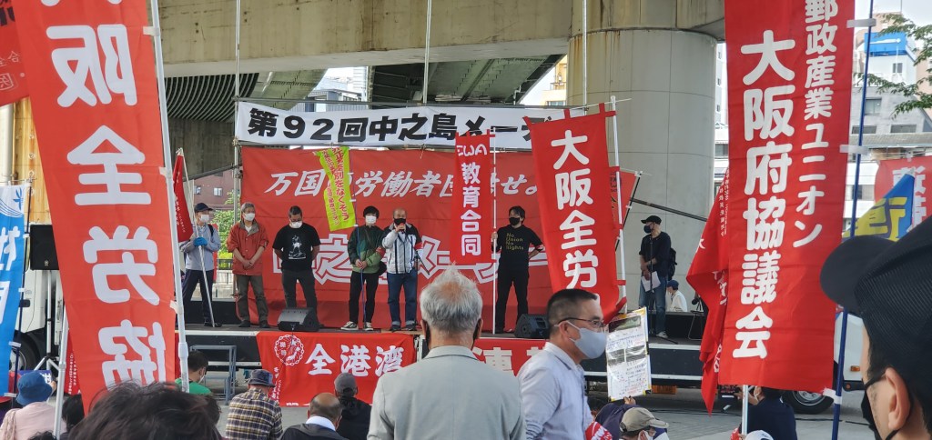 新型コロナの感染拡大が続くなか、多くのメーデーが中止や1名だけの代表参加、あるいはオンライン実施に変更されている。そのなかで、第92回中之島メーデーは「コロナ禍を口実にした不正義、不利益をゆるさない!」掲げて開催された。会場の中之島公園・剣先ひろば(大阪市北区)では十分な感染対策が取られ、300人が集まった。