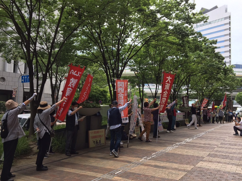 サンケン電気本社(埼玉県)への申し入れ行動を理由に5月10日に「暴行」容疑ででっち上げ逮捕された仲間を、同31日、埼玉地検は「威力業務妨害」を加えて起訴した。韓国サンケンによる労働組合つぶしのための偽装倒産にたいする日韓の闘いの広がりを恐れた弾圧だ。6月3日の昼休み、サンケン電気本社、東京営業所、大阪支店前で抗議行動が取り組まれた。大阪では、おおさかユニオンネットの呼びかけで全港湾大阪支部、連帯ユニオン関生支部、大阪全労協、韓国サンケン電気労組を支援する大阪市民の会など多くの組合、市民団体が参加。逮捕・起訴された仲間の釈放と韓国サンケン労働者の解雇撤回を訴えた。