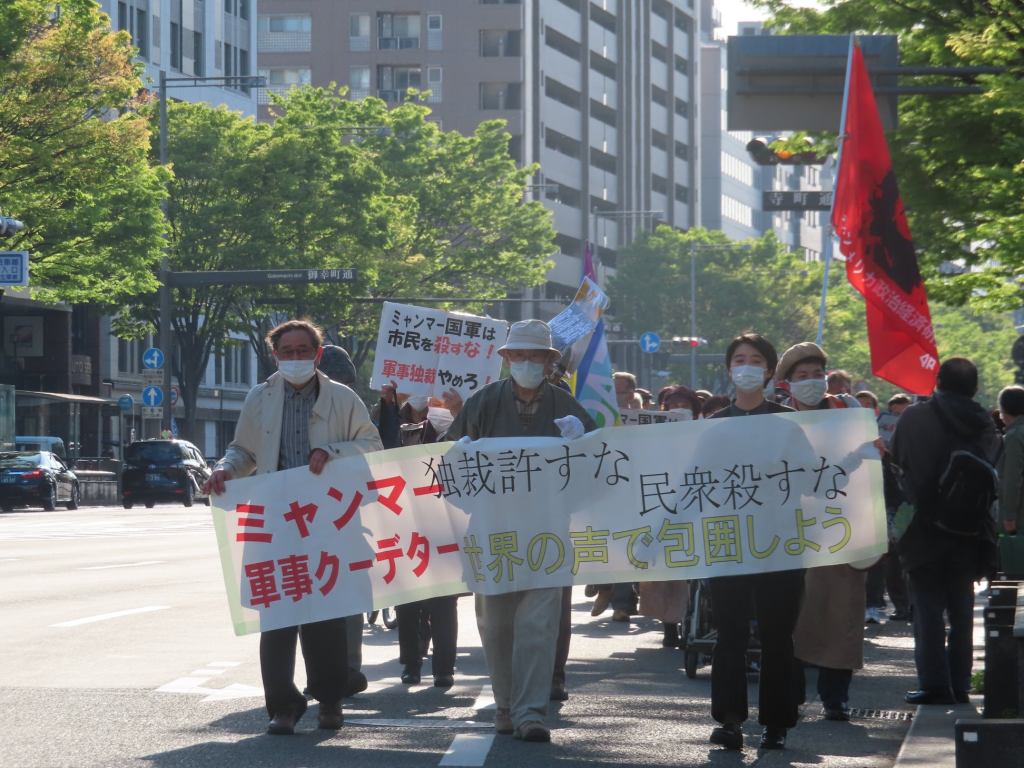 ミャンマー国軍による軍事クーデターに反対するデモが、4月11日、京都市内でおこなわれた。100人が参加した。京都市役所前で開かれた集会では、立命館大准教授の徳丸夏歌さん、衆院議員の穀田恵二さんなどが発言。デモ行進で、沿道の市民に「ミャンマーの民衆を殺すな」と訴えた。