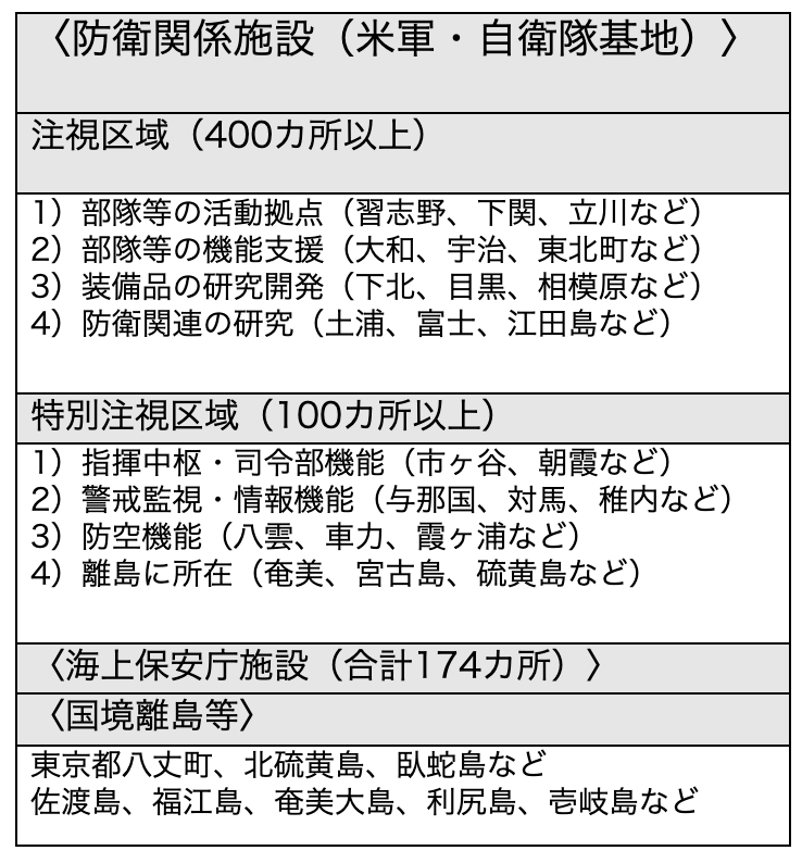 防衛相が明らかにした区域指定の候補リスト(【表】参照)によれば、自衛隊基地の周囲1キロ圏内の住民などを監視対象とする「注視区域」が四百数十カ所。一定規模の土地の所有権移転に事前届け出を義務付ける「特別注視区域」が百数十カ所。これから政令で定める「生活関連施設」には原子力関係施設、自衛隊が共用する空港などが含まれる。将来的にその対象が拡大する可能性が高い。
