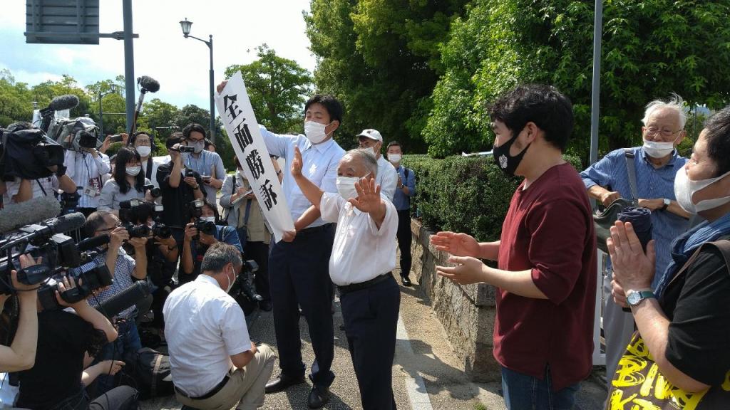 「8月6日」の朝のように、照りつける日差しの中。広島高裁正門前で待ち受ける原告や支援の人たちに、傍聴者が法廷から走って来る。「走っている!」「勝ったか!」と声が上がる。「全面勝訴」広げられると大歓声が上がり、涙ぐむ原告ら。