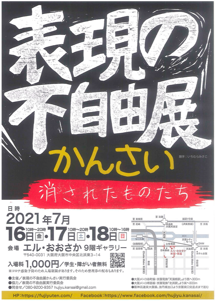7月9日、大阪地裁(森鍵一裁判長)は、「取り消しは憲法違反」とし、エルおおさかの利用を認める決定を出しました。、この決定によって、予定通り開催できることになりました。しかし、吉村知事は「高裁に即時抗告する」と悪あがきしています。吉村知事に抗議を!企画展を成功させ、「表現の自由」を守りましょう。(隅)
