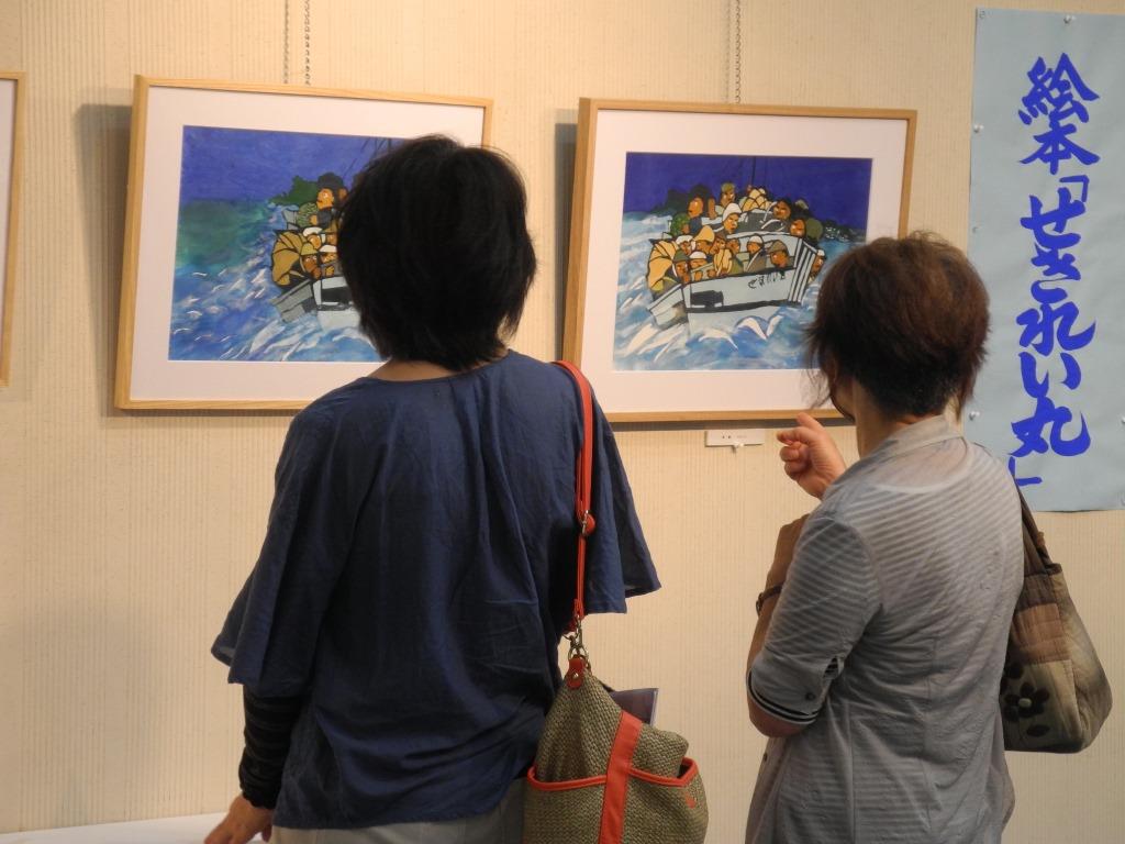 メインの展示は、昨年11月に刊行された田島さんの絵本原画『せきれい丸』。76年前の敗戦直後12月、明石と淡路・岩屋を結ぶ連絡船が定員の数倍もの乗客を乗せ岩屋を出航後、すぐに転覆沈没。死者行方不明が300人を超えた。生存者わずか50人足らずという悲惨な事故を題材に、1人の少年が悲しみを乗りこえ命の大切さを感じて生き抜く絵本である。原画23枚すべてを展示する初めての地元開催で、事故を知る人も訪れていた。