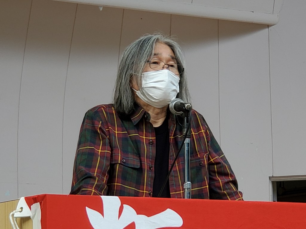 「このようなたたかいは戦争政策に反対するたたかいと表裏一体だ」と述べて、鵜飼さんは自民党が選挙公約に掲げた「敵基地攻撃能力」に言及した。「防衛費のGDP比2%以上(年10兆円超)を目指す政権とは何か。この意図を打ち砕かなくてはならない」と語気を強めた。さらに話は、コロナ禍で女性への犠牲が集中していることにおよんだ。特に働くシングルマザーの貧困率はOECD諸国で最悪である。公平な分配のためにはジェンダー視点に貫かれた分析に基づいた構造的変革が不可欠なのだ。最後に「時代を超え、国を超えて民衆の平和に生きる権利を獲得するたたかいをとも進めていこう」と述べて公演を締めくくった。