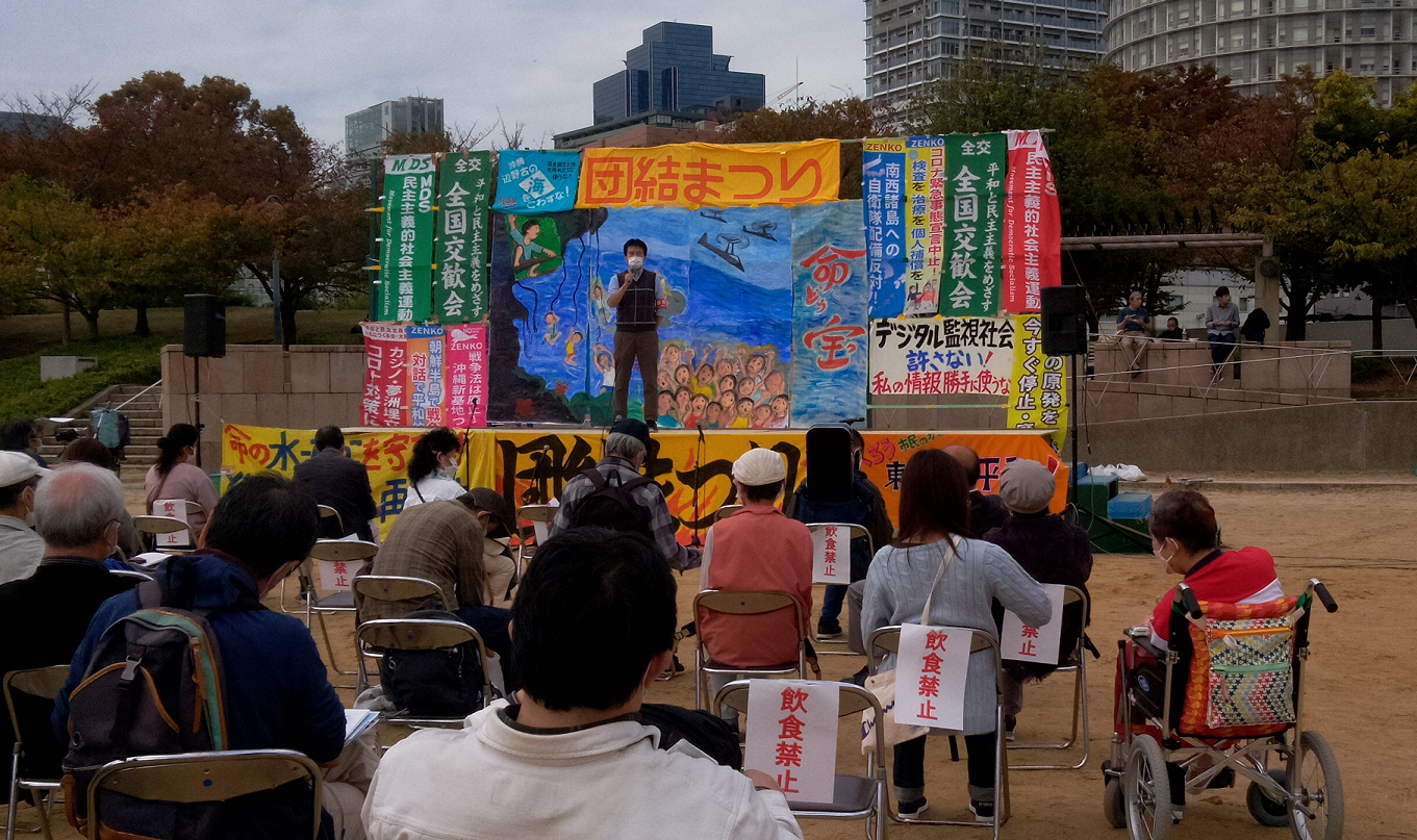 10月31日、ZENKO(平和と民主主義をめざす全国交歓会)主催の団結まつりが行われました。扇町公園の平場に舞台と観客席が設けられ、それを囲むように出店が並んでいました。
