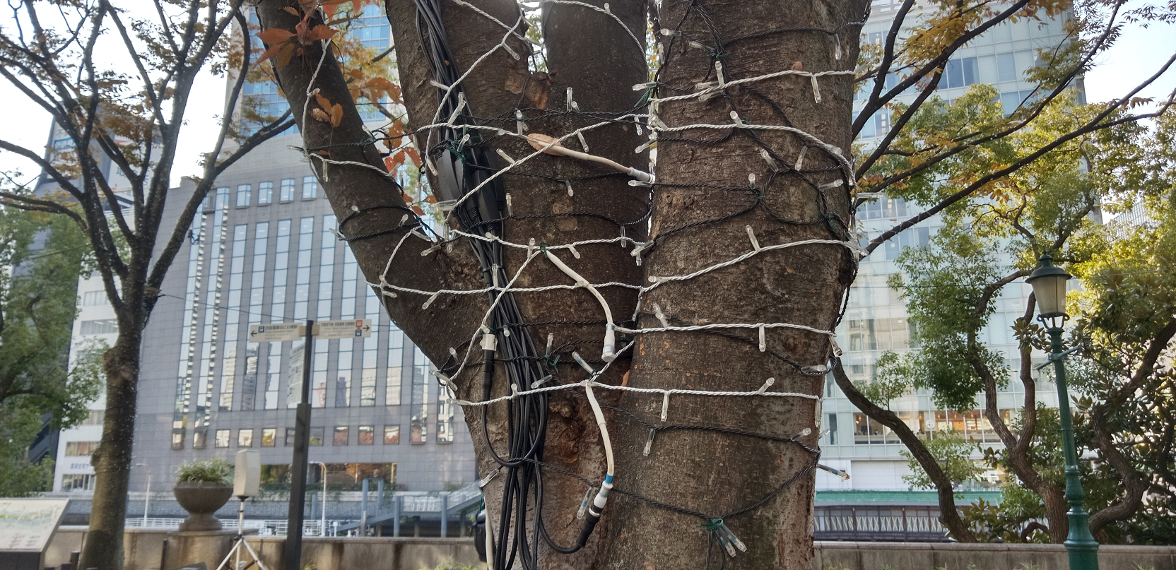 文化 まい・しょっと-19 Date: 2021年11月22日Author: 未来への協働 0 コメント イルミネーションは美しいが… (撮影日 11月15日) 大阪市役所の南側の通りは 冬になると木々がイルミネーションで光り輝く。 しかし、コードを巻きつけられている木々に 悪影響はないのかな? (民 共有:Tweetいいね 読み込み中… 関連