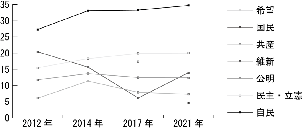 維新の獲得議席は、民主党政権から安倍政権になった12年総選挙で54、14年41と伸び、17年は11に減らしている。比例得票率は、それぞれ20・4、15・7、6・1%である。今回は12年、14年に「戻した」とも言える。維新は7、8年年前から兵庫へ地方議員、支持票を伸ばしてきていた。