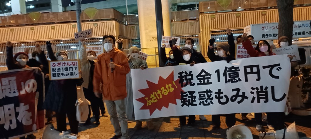 23日夕、大阪の近畿財務局前に「森友問題を考える会」のよびかけで約100人が集まり、 怒りの声をあげた。「ふざけるな! 税金1億で疑惑をもみ消し」「赤木さんの死を無駄にしないで」などの横断幕や手作りのボードをかかげた。東京の財務省前でも同時行動が取り組まれた。