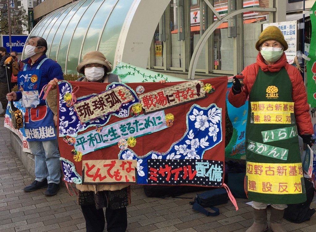 2月12日 参加者は18人、署名20筆、チラシ配布は110枚。人通りも多く、快晴。着込んでいるせいか少し暑かった。署名の依頼に、「辺野古基地に反対はわかるけど、どこにつくるのか」と。「どこもいらない」と言うと、「無責任!」と立ち去った。「活動している人は、年寄りばかり」という人もいた。