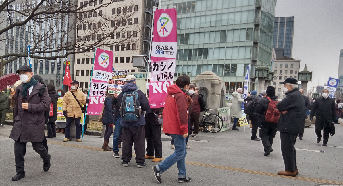 大阪市はカジノ(IR)の説明会を1月7日から2月14日にかけて11回開催するとしていたが、コロナを口実に2月5日以降の説明会を中止した。維新には住民の意見を聞く気はさらさらない。大阪市会が開会した2月10日午後12時から一時間、大阪市役所南西角で誘致に反対する街頭宣伝が行われた。カジノに反対する市民200人が集まり、横断幕を広げ、のぼり旗を持ち、チラシを配った。参加者は代わる代わるとマイクを握って、街ゆく市民に訴えた。街宣終了後、カジノ誘致計画の中止・撤回を求める署名7万1000筆をIR推進局に提出した。