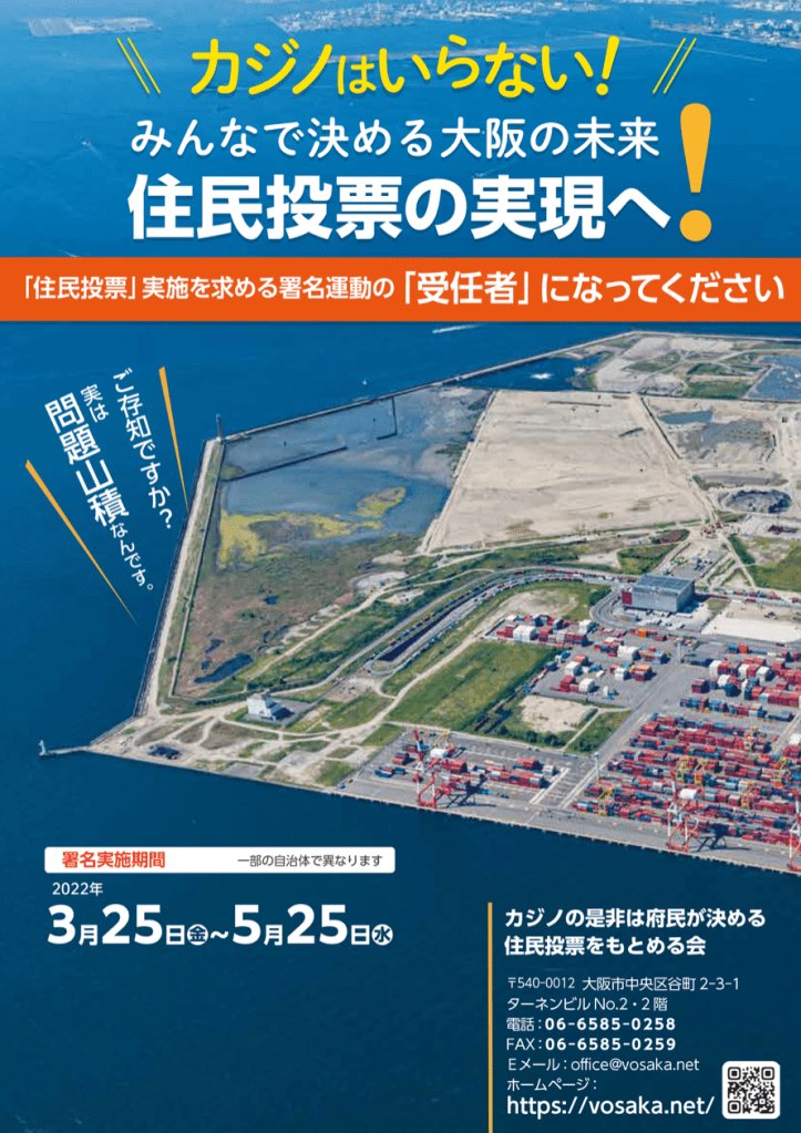 署名運動については「カジノの是非は府民が決める 住民投票を求める会」のHPで「手引き」などを読んで受任者(署名を集める人)になってほしい。ホームページhttps://vosaka.net/ で受任者登録ができる。