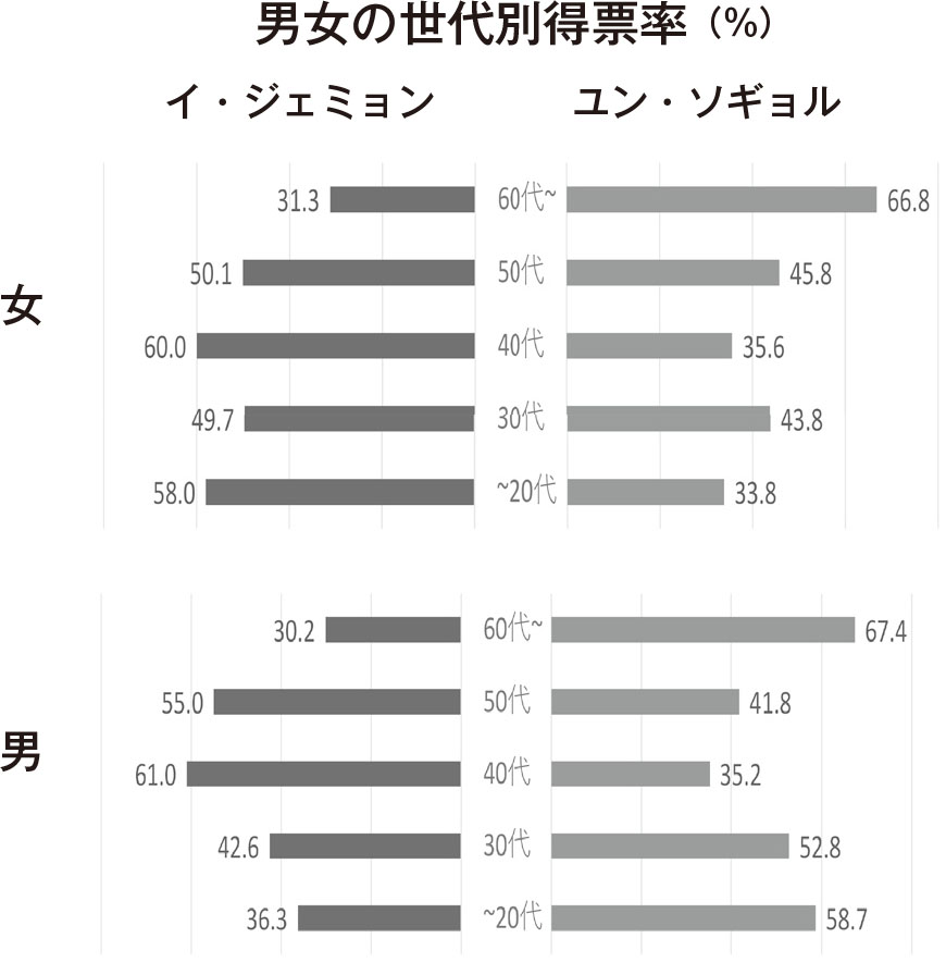 その結果どうなったか。20代から50代までの女性が一斉にイ・ジェミョンに投票した(表参照)。ジェンダー平等破棄を掲げたユン・ソギョルに対して女性たちが結束して起ち上がったのである。それが予想外の僅差に迫った原動力だった。