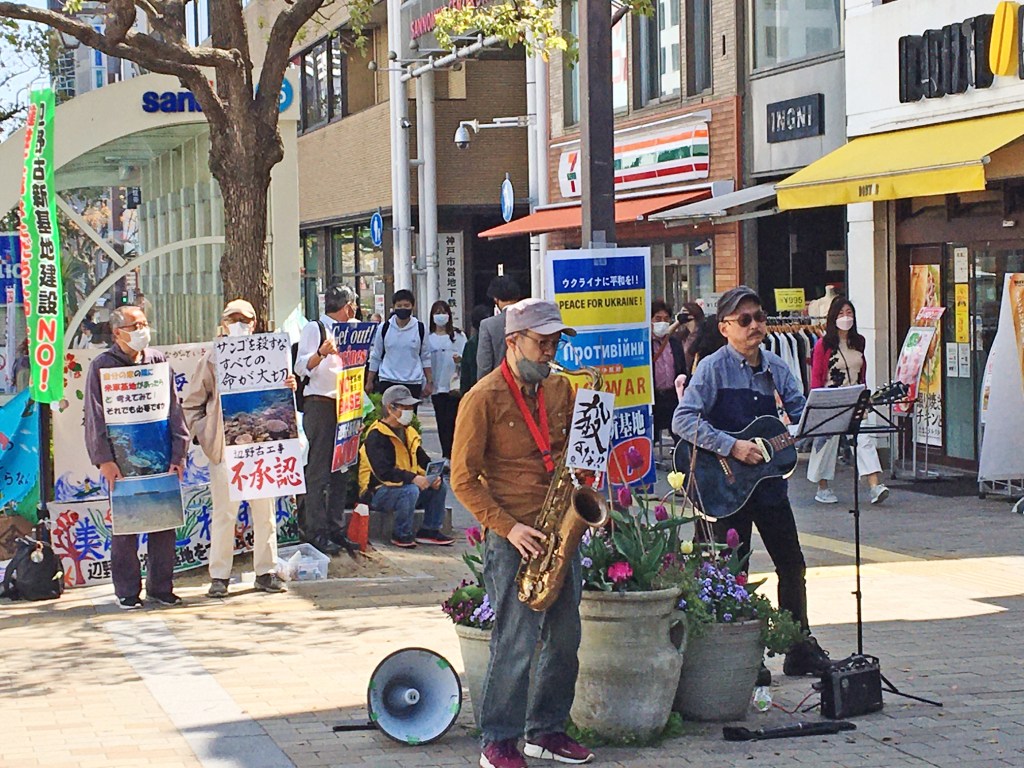4月2日 神戸三宮・マルイ前「辺野古の海に基地をつくらせない神戸行動」。快晴で少し肌寒い。人通りは多かった。参加者18人、署名数16筆、チラシ配布は200枚。高校生たちが「戦争反対、平和は大事」と言う。「ジュゴン」の折り紙を持ち返った。