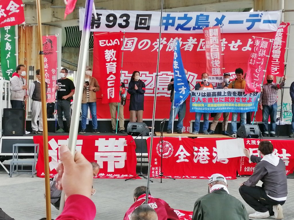 LIA労組、郵政ユニオン、関西合同労組、教育合同、学生メーデー実行委、ケアワーカーズユニオン、JAL争議、全港湾が、厳しい中での粘り強い闘いを報告し、支援を訴えた。関西生コン支部の湯川委員長は「生活を奪われ、職場が分断され苦しむ仲間の姿をクローズアップしたい。さらに大きな陣形をともにつくろう」とまとめた。