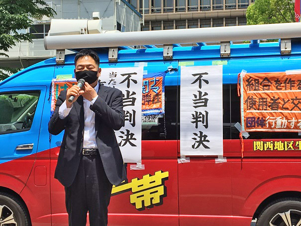 関西生コン弾圧(第1次事件・威力業務妨害罪)に対する大阪高裁控訴審(5月23日)は、控訴棄却の不当判決だった。一審は、副委員長、執行委員はじめ7人が、懲役1年6カ月〜2年、執行猶予3〜4年の重罪判決。連帯ユニオン関西生コン支部はじめ労働組合、市民団体が高裁前に集まった。「控訴棄却」の判決に座り込み参加者から、抗議のシュプレヒコールがあがった。