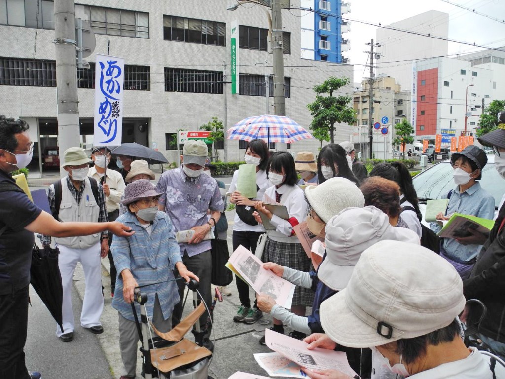 ピースネット明石主催の「あかし戦跡めぐり」が行なわれた(6月11日)。曇り空、36人が参加した。2010年から10年続いたピースウォーク明石を引き継ぐ。現場で戦争体験談を聞く。