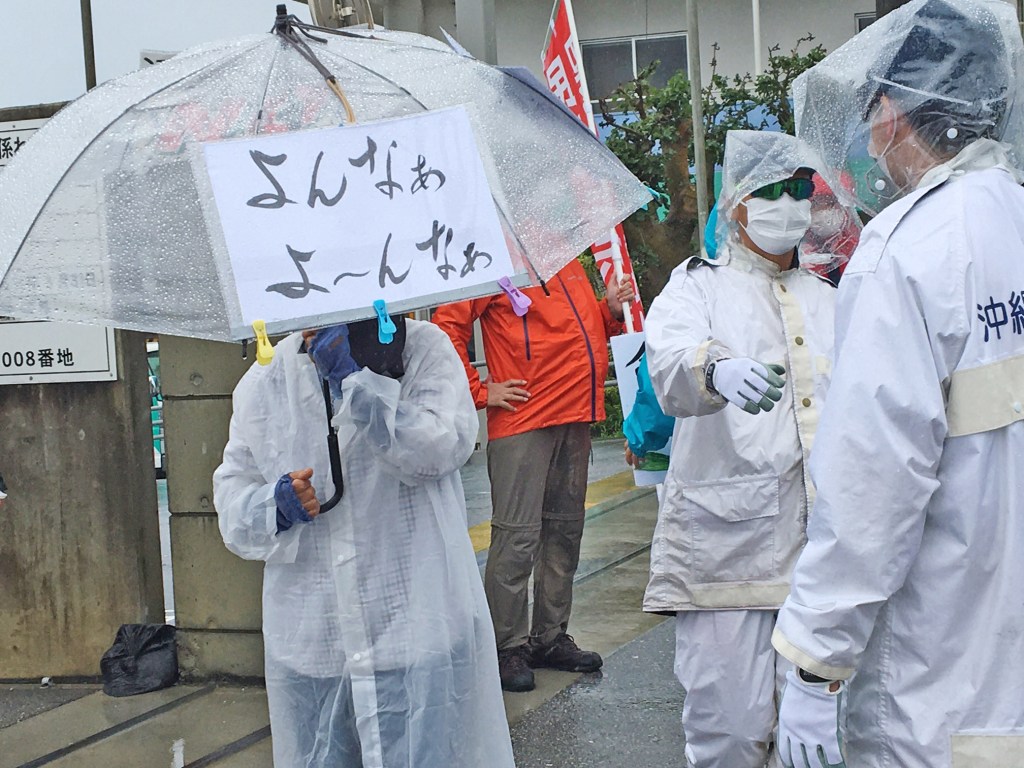 安和桟橋の入口には「民意は示された。辺野古新基地ノー!」「違法工事を中止し、予算をコロナ対策へ!」ののぼり旗がはためく。「新基地はいらない」「美(ちゅ)ら海を守ろう」と書かれたボードを手に持ち、ダンプの前をゆっくりと横断する。土砂搬出を遅らせるためだ。ひとりの女性がさしていた傘に、「よんなぁ、よーんなぁ」と書いてある。「ゆっくり、ゆーっくり」という意味だった。