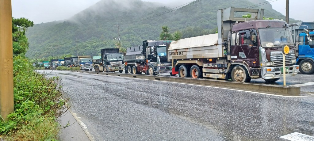 本部町側からの海岸伝いに続く国道449号線、その2車線道路の1車線を数10台のダンプカーが延々と連なっていた。桟橋入口付近ではガードマンがダンプカーの警備に当っている。抗議活動を規制するのは沖縄県警だ。構内には機動隊の〝かまぼこ〟(警備車両)が止まっている。