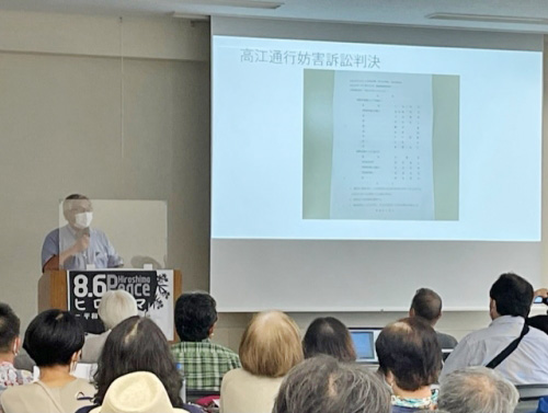 「8・6ヒロシマ平和の夕べ」。今年の平和講演は「沖縄と本土、核」について三宅俊司さん(沖縄弁護士会)が話した。被爆証言は、世界に被爆の実相を伝えてきた小倉桂子さん。福島からは京都に避難している福島敦子さん。要旨を紹介する。(本紙編集委員会)