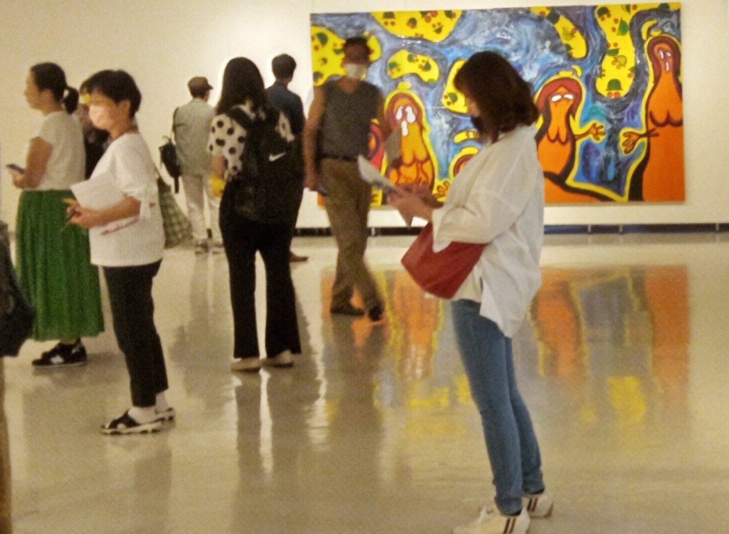 会場外にいたため、ゆっくり作品を見られなかった。何人かの人に感想、意見を聞いた。「平和の少女像の横に座らせてもらった。胸に迫り、痛み、ゆっくり座ることができなかった」「丸木位里・俊さんの『ピカドン』。1950年に出版という手づくりに近い絵本。数頁の展示だが真実に迫る」「梅雨空に九条守れの女性デモ~秀句とされながら公民館だよりから排除された。2014年のこと」「反戦、反帝の旗に見入った」。侵害されてきた表現が、人を激しく揺さぶっている。