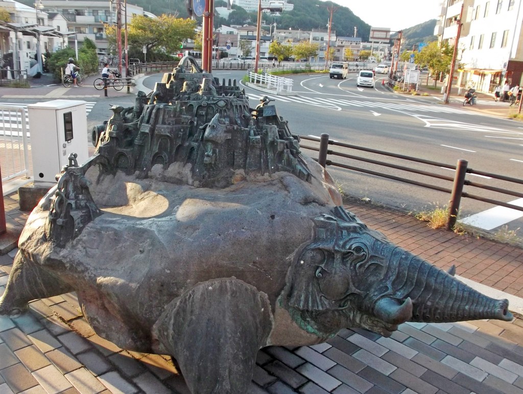 奇妙なオブジェ(本紙317号に「奇妙な銅像」)、その2。銘板に『カルタゴ』とある。現在のチュニジアにあった古代都市。ローマとの戦争で廃墟になったが、美しい港町として再生した。「大震災から復活してほしい」と作られたらしい。亀か犀か、空想の動物か、わからない。製作・設置は1997年。