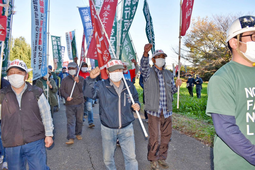 三里塚芝山連合空港反対同盟は11月27日、成田市天神峰の市東孝雄さん宅中庭で現地闘争を行った。各地から280人が参加し、成田空港へデモ。「市東さんの農地と生活を守り抜こう」と決意を固めた。現地は臨戦態勢に入った。翌28日は、千葉地裁で耕作権裁判(民事第2部、本田晃裁判長)が開かれ、裁判所の審議打ち切り策動を阻止した。(写真は反対同盟のHPから転載)