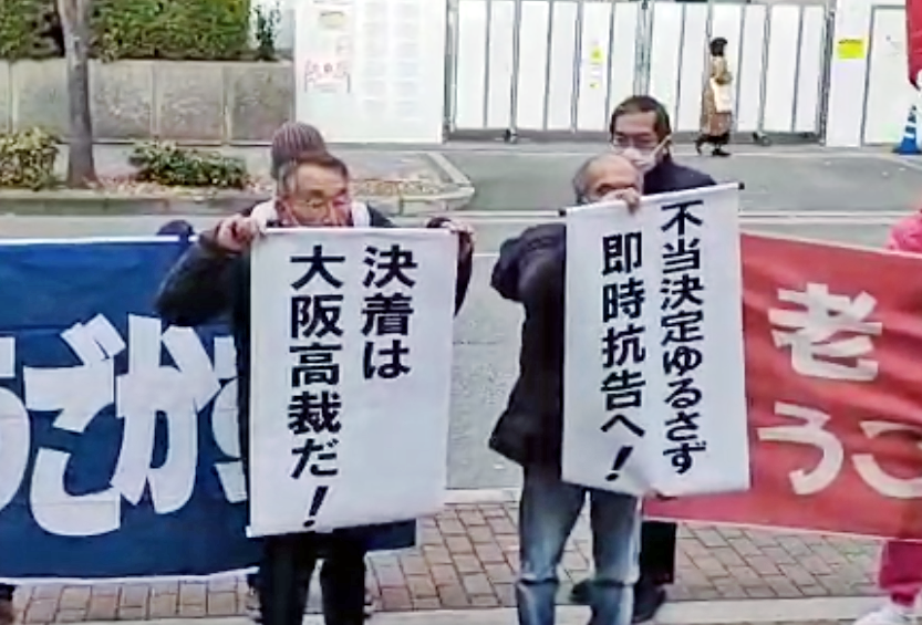 全国の原発で唯一運転開始から40年を超えて稼働している関西電力美浜原発3号機(福井県美浜町)について、大阪地裁(井上直哉裁判長)は、20日、運転差し止めを求める仮処分の申し立てを退ける決定を出した。当日の正午から原告と支援者は大阪地裁前で集会。午後2時過ぎ、不当決定の報が入った(写真上)。集会に参加していた井戸謙一弁護士は、「判決は政府の原発政策の転換に影響を受けているのか。司法のあり方としてたいへん残念」と話した。