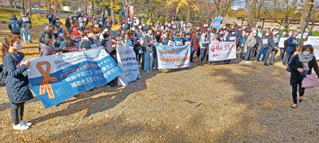 毎週火曜日、正午から1時間、大阪府庁前で朝鮮学校への補助金支給再開、朝鮮高級学校への「高校無償化」即時適用を求めて、アピール行動を行っています。この「火曜日行動」が12月13日で500回を迎えました。この日、大阪城公園(大阪市中央区)で500回を記念する集会が開かれ、大阪府庁周辺でミニパレードを行いました。朝鮮学校の保護者、教職員、地域同胞、民族団体の関係者、そして日本人の支援者など300人が集まりました。