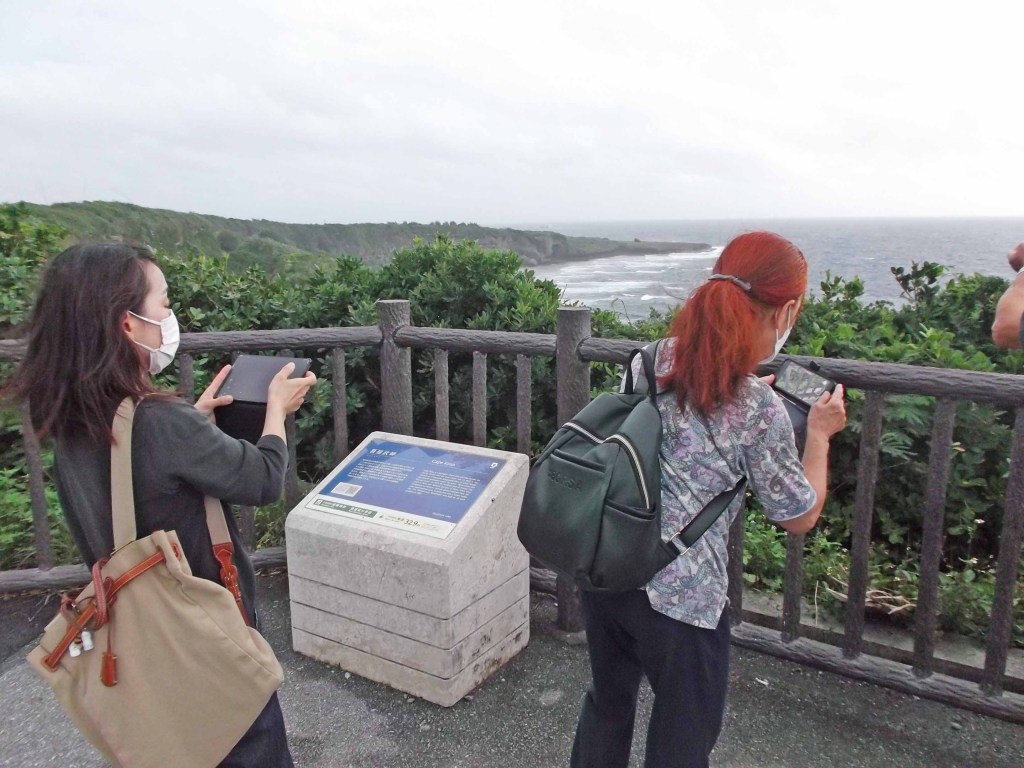 糸満市で写真家の大城弘明さんと合流する。さとうきび畑や雑草地を縫いながら最南部の喜屋武岬、荒崎海岸へ。広がるさとうきび畑は、米兵や米軍機の銃火から逃れる陰になっただろうか。喜屋武岬に建つ「平和の塔」前の広場から、人びとが海に降りようとした細道を下る。茂みや倒木に覆われた険しい小道は雨でぬかるみ、案内の大城弘明さんが「危ないから、先はやめましょう」と戻る。糸満では、ときどき雨に見舞われた。