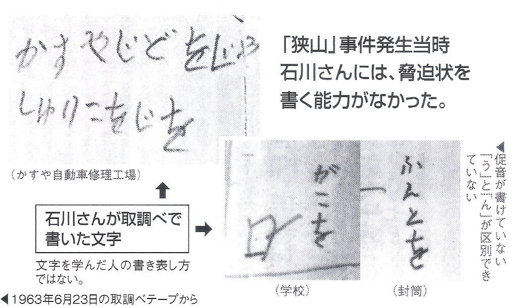 ひらがなは原則的に一音に一文字が対応するが、促音や拗音のように二文字が対応する書き方を石川さんは知らなかった。だいたい促音は音としては読まないから、それを知らずに書くと石川さんのように「がこを」となってしまう。周知のとおり脅迫状には、ひらがな表記の誤りは皆無なのだから、これだけで石川さんが脅迫状を書いていないことは明らかなのだ。