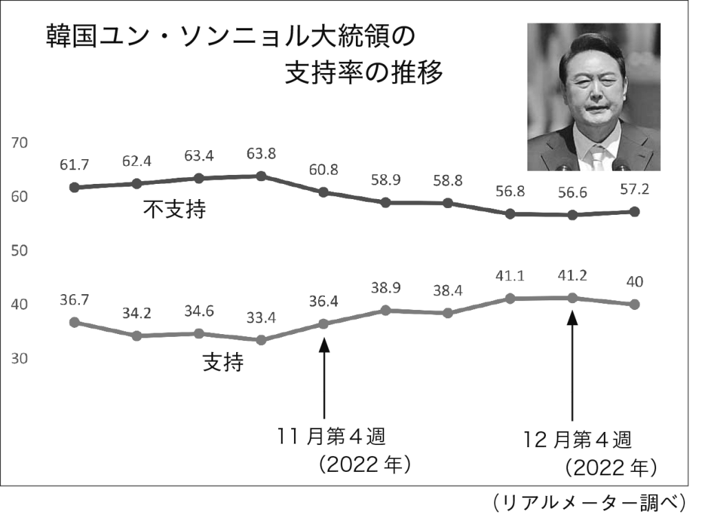 このように支持率の低迷を続けていたユン政権だが、韓国リアルメーターの調査では、11月第4週の36・4%からじりじりと上がって、ついに12月の第4週は41・2%になった。これは決して高い支持率ではない。このときの不支持率は56・6%で、依然として支持を上回る現象が続いていたが、とにかく支持率は上昇したのである。
