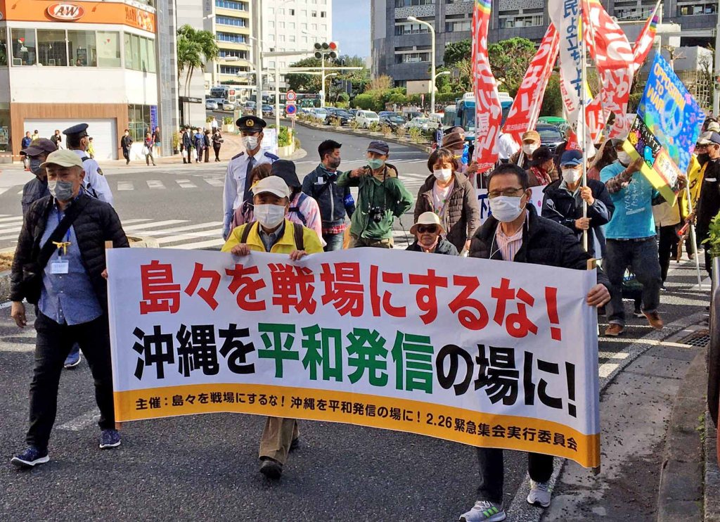 「島々を戦場にするな 沖縄を平和の発信の場に 2・26緊急集会」が那覇市の県民広場で開かれた。宮古島をはじめ南西諸島の軍事基地化に対し、緊急に1000人集会として企画された。集会にはそれを上回る1600人の県民が参加し、抗議の声をあげた(写真上)。与那国、石垣、宮古をはじめ沖縄島からも、若者たちも多くの参加があった。