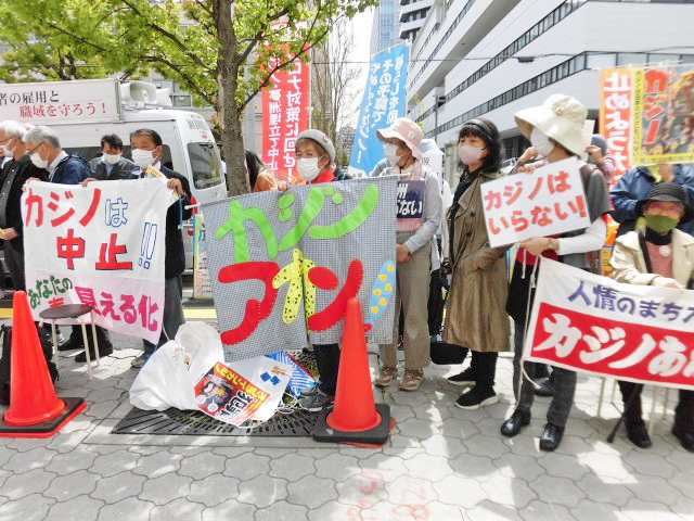 4月9日投開票の統一地方選前半戦で大阪府知事、大阪市長ともに大阪維新の会の候補が当選した5日後の14日、政府は、大阪府と大阪市が申請した夢洲IR(カジノ)区域整備計画を認定しました。この報を受けて14日昼、夢洲カジノを止める会をはじめカジノに反対する市民150人が大阪府庁南側に集まり、「カジノはいらない」と抗議の声をあげました。