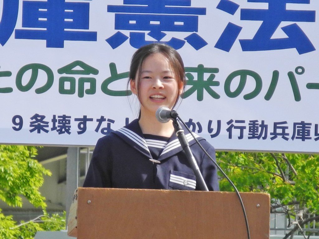 高校生平和大使の長冨日向(ひなた)さん(写真上)が「ウクライナ戦争の終わりが見えない。80年前の戦争がアジアの国々の人たちにどんな被害をもたらしたのか、知らない人も増えている。安保3文書で新しい戦前になってしまうのでは。それが私たちの望む未来でしょうか」と5・3憲法アピールを読み上げた。