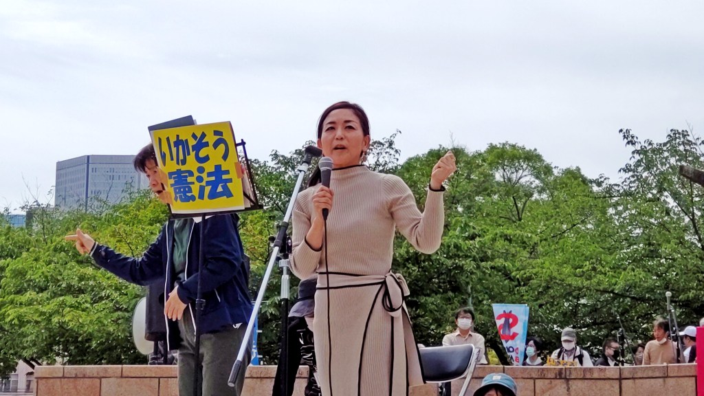 憲法記念日の5月3日、大阪市北区の扇町公園で開かれた憲法集会では、弁護士で新外交イニシアティブ代表の猿田佐世さん(写真上)がメインスピーカーとして登壇。猿田さんは昨年12月の安保3文書改定で、日本が「敵基地攻撃能力」を保有することについて、「日本が攻撃されていないのに、米国を攻撃している国にミサイルを撃ち込んで破壊する。国際法にすら違反する先制攻撃が認められるようになってしまった」と批判、「この大きな変化にたいして、国民が議論し、9条を具体的な形にしていかなければ、9条は本当に死んでしまう」と述べた。また、米国の研究者による過去150年間に起きた戦争の調査では、紛争を抱える二国が軍拡すれば82%が戦争になったが、軍拡しなければ96%が戦争にならなかったことを紹介。「日本が米国の片棒さえ担がなければ、日本はどこの国とも戦争になる可能性はない。米軍に日本の基地を使わせない取り組みが重要だ」と訴えた。最後に日本国憲法が誕生した当時活動していた女性が「自分たちの必死な努力で憲法を手に入れた」と話したことを紹介し、「若い世代につないでいきましょう。この憲法を。私たちの必死な努力で」と呼びかけて、スピーチを締め括った。