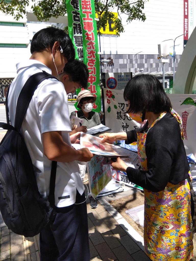 6月10日(土)「友人から、いろいろ聞いています」(若い女子学生さん)。娘さんとお母さん、海の写真を見て娘さんが「きれいな海やね」。「その海が埋立ててられ、基地に」と話すと、親子3人とも署名。国境なき医師団の人たちから署名をしてもらった。「お互いがんばりましょう」とエールを交換する。