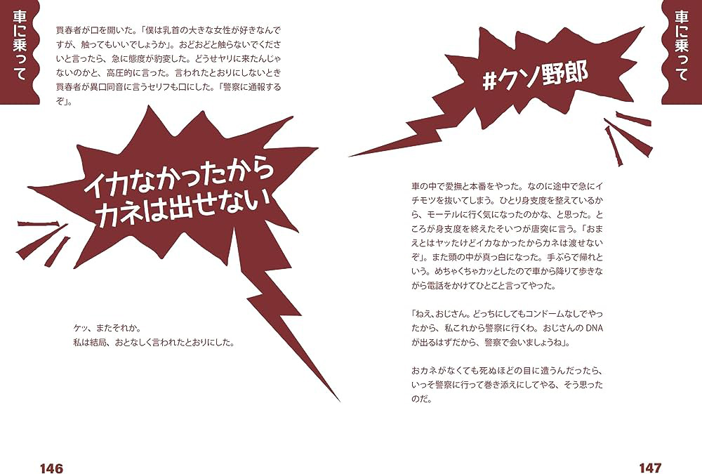 「なかなか好人物との店主の評価の客も、買春の空間に来たら、値引きを求めたり、タダでやろうとしたり、私に借金を背負わせたり、『昼間に外で会おう、恋人になろう』はタダでやりたいという意味」「いくら仕事をしても自分で金を手にしたことはない。ただ店主の帳簿上で金が動き、そしていつまでたっても借金は減らない」