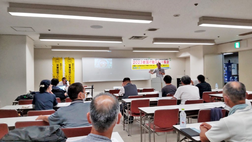 米軍岩国基地の地元から、「住民投票を力にする会」の松田一志さんを招いて、「2023岩国行動スタート集会」が7月28日、大阪市内で開かれた。(主催、岩国労働者交流集会実行委、写真上)。松田さんは、昨年12月3日に発生した米軍岩国基地所属の海兵隊員による自動車窃盗・交通事故・器物損壊の事件に関して、驚くべき事実を報告した。