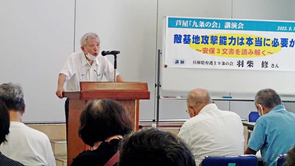岸田政権の軍拡に、市民、地域からは異議申し立ての声が上がる。「敵基地攻撃能力は本当に必要か~安保3文書を読み解く」学習会が、約80人が集まって開かれた(9月16日、芦屋「九条の会」主催、芦屋市内、写真上)。講師は弁護士の羽柴修さん(兵庫県弁護士9条の会)。