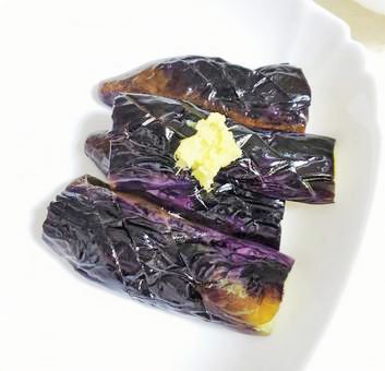 美味しい焼きナス作り方。ナスのお尻からヘタに向けて割りばしを通し、穴を開けてから焼く。穴から水分が出て、皮が破れず、旨味が逃げない。皮がパリパリになるまで焼くと、軽く揉むだけで皮はすぐとれる。(淡)