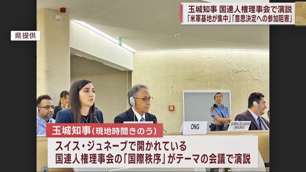 9月18日から23日にかけて国連人権理事会総会に出席した玉城知事は、「辺野古新基地建設については県民投票で県民の7割が反対しているのに、工事を強行している」と政府の民主主義軽視を訴えました(写真)。