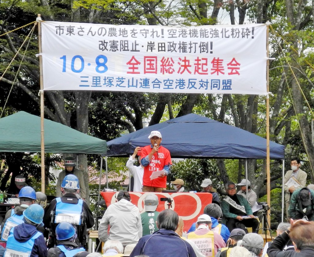 成田空港の機能強化と農地の取り上げに反対する全国集会が、10月8日、成田市内で開かれ、520人が参加しました(写真左)。