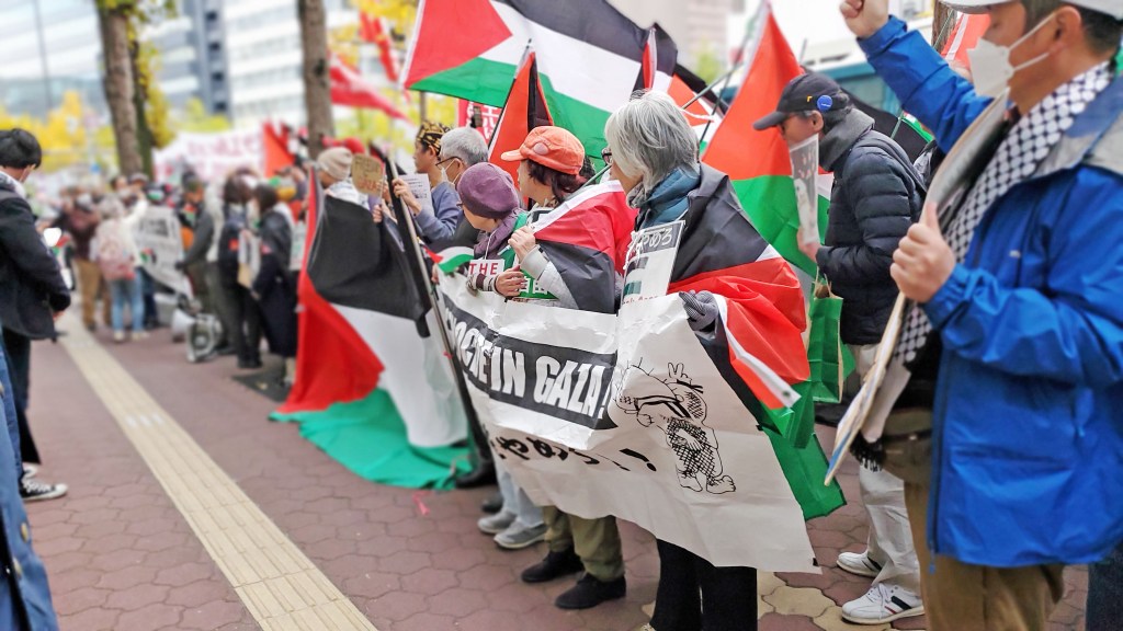 パレスチナ, 国際, 地方政治・住民運動 米はイスラエル支持をやめろ 11月29日 大阪総領事館に抗議 Date: 2023年12月9日Author: 未来への協働 0 コメント 11月29日、1947年に国連総会でパレスチナ分割決議が採択されたこの日、大阪の米総領事館前で、イスラエルの民族浄化政策を支援する米政府に抗議行動が行われ350人が参加。呼びかけは関西ガザ緊急アクション。ガザ出身のパレスチナ人、ハニンさんは「ガザへの空爆は21世紀のジェノサイドだ。この悪夢をいますぐ止めなければ。米国はイスラエル支援をやめろ、日本は加担するな。パレスチナは永遠に滅びることはない!」と訴えた。 共有:Tweetいいね 読み込み中… 関連